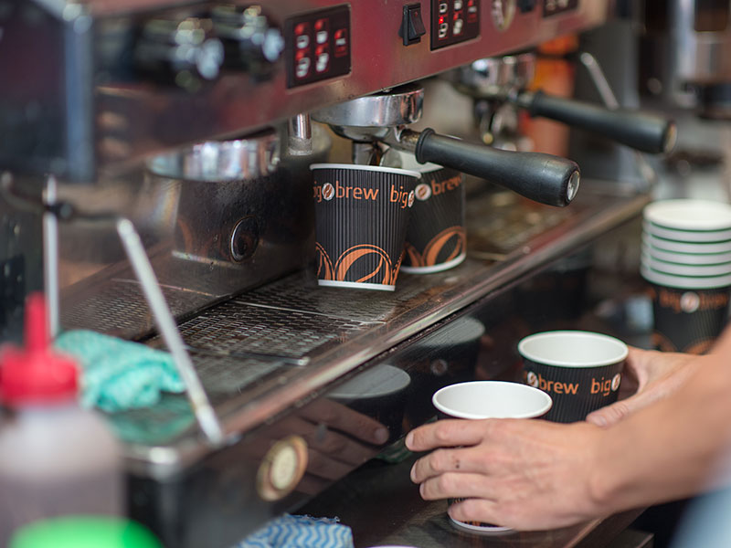 It also serves pies, sausage rolls, biscuits and the famous mega-muffins. A full selection of beverages is also available, including coffees and teas, soft drinks, juices and milk drinks.