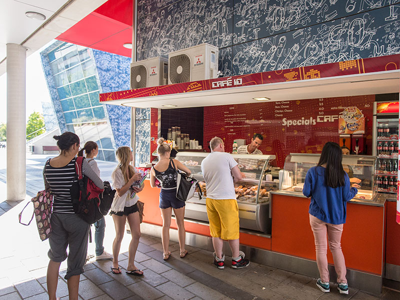 Cafe 10 is open for breakfast, lunch and early evening dinners, offering a wide range of sandwiches, rolls and baguettes, as well as sushi, rice paper rolls, vegetarian choices and Indian curries.