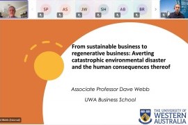 The webinar "From Sustainable Business to Regenerative Business," presented by Associate Professor David Webb from the University of Western Australia, was hosted by The Centre for People, Place and Planet at Edith Cowan University. Moderated by Associate Professor Mehran Nejati, CPPP's Associate Director of Research Operations, the event was a collaborative effort with the ANZAM Sustainability and Responsible Management Special Interest Group as well as the Australia and New Zealand Chapter of PRME.